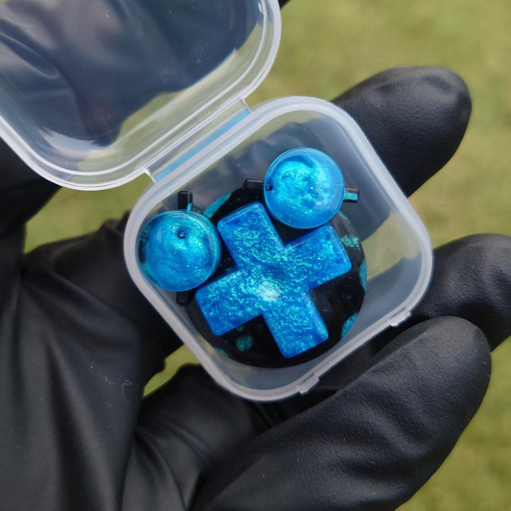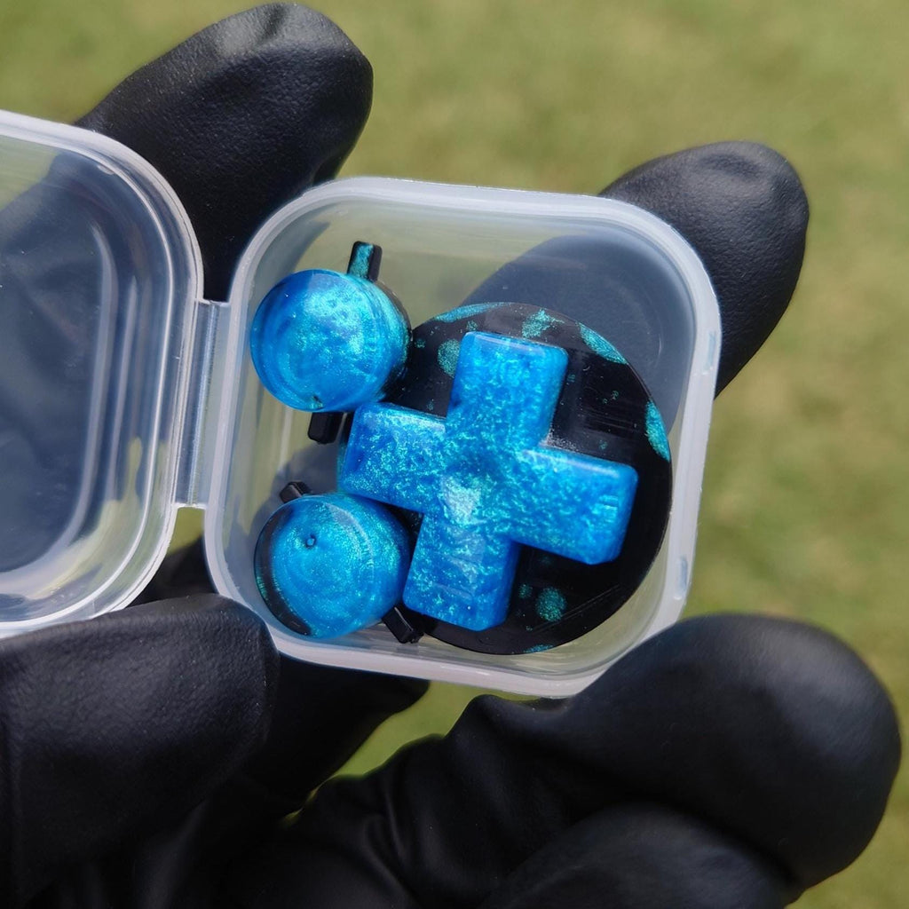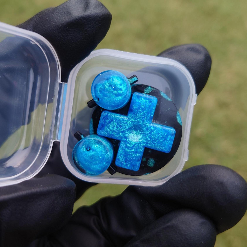 This listing is for a "Calm Sea Nebula" DMG Gameboy (DMG) button set made using a refreshing blue pigment, and finished off with a dash of sparkles to resemble stars!