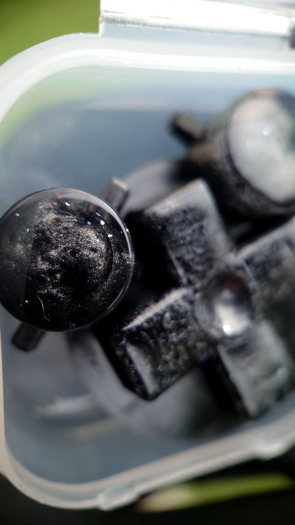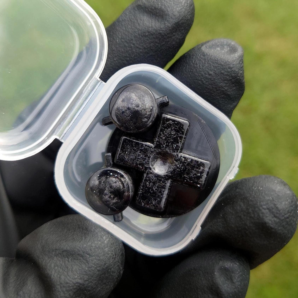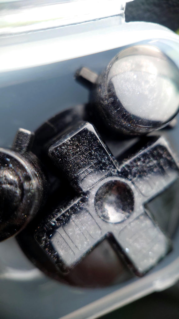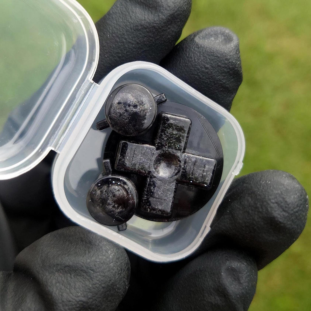 This listing is for a "Stealth Graphite Nebula" DMG Gameboy (DMG) button set made using a nightly black pigment, and finished off with a dash of sparkles to resemble stars!