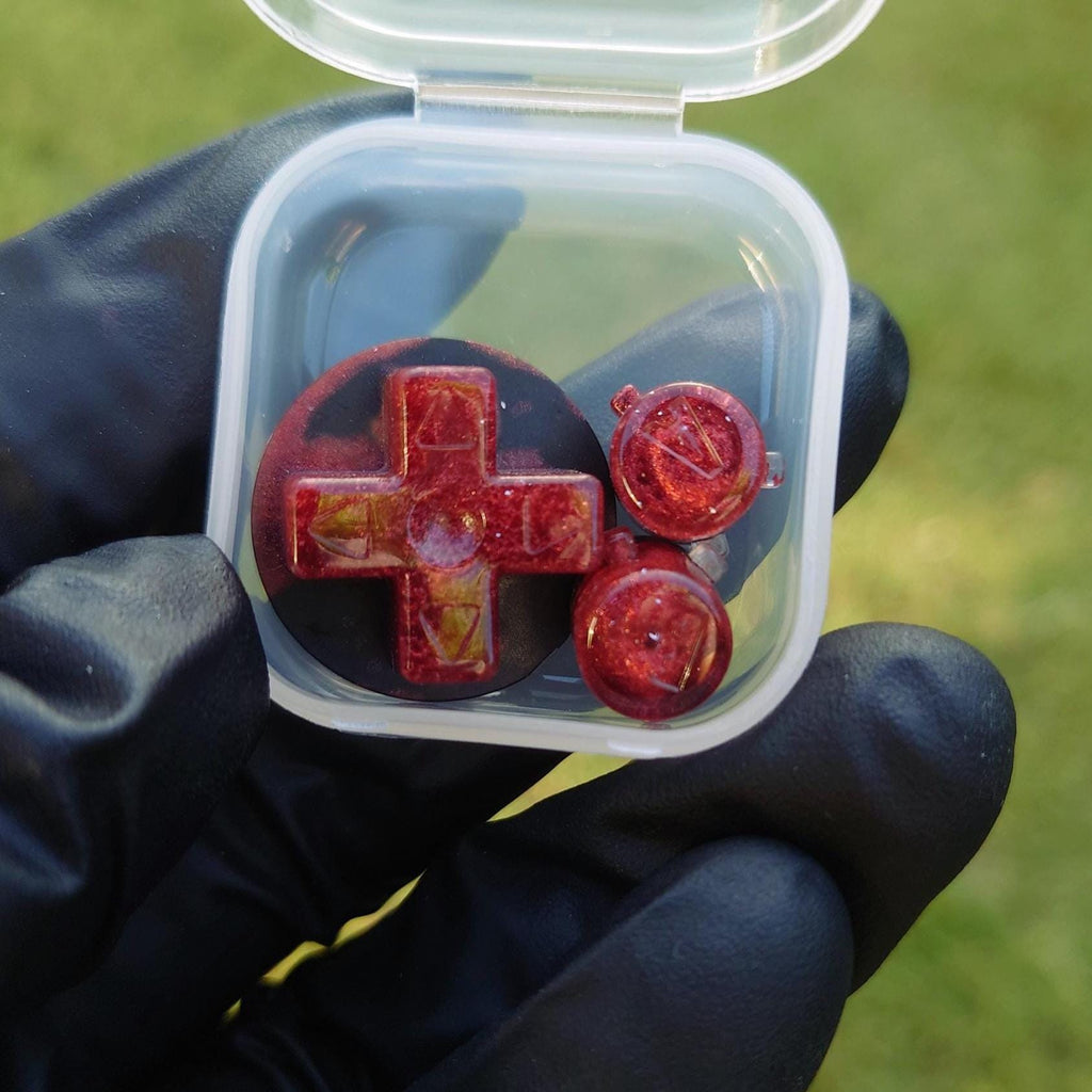 This listing is for a "Blood Red Nebula" Gameboy Advance (GBA) button set made using a ruby red pigment, and finished off with a dash of sparkles to resemble stars!