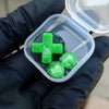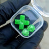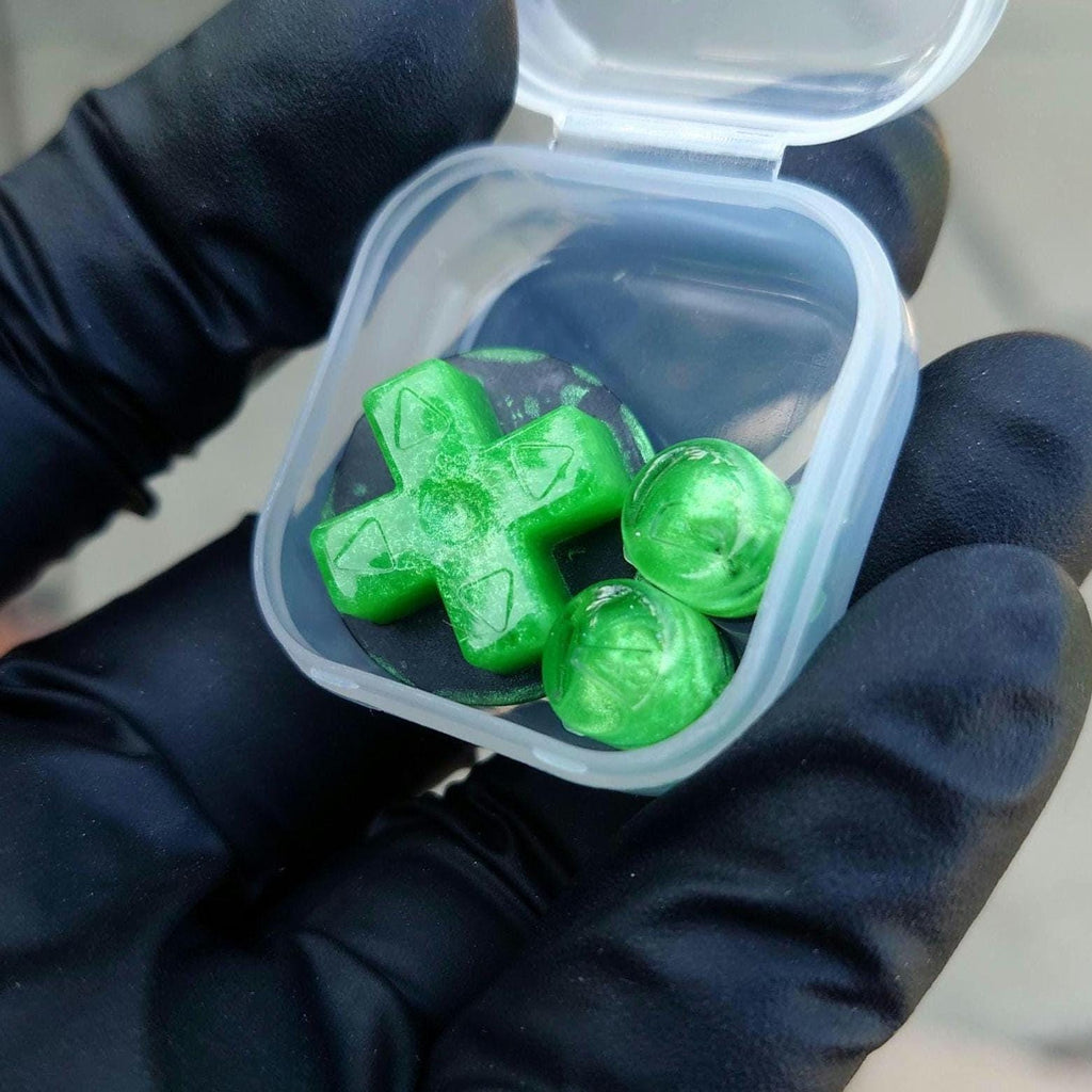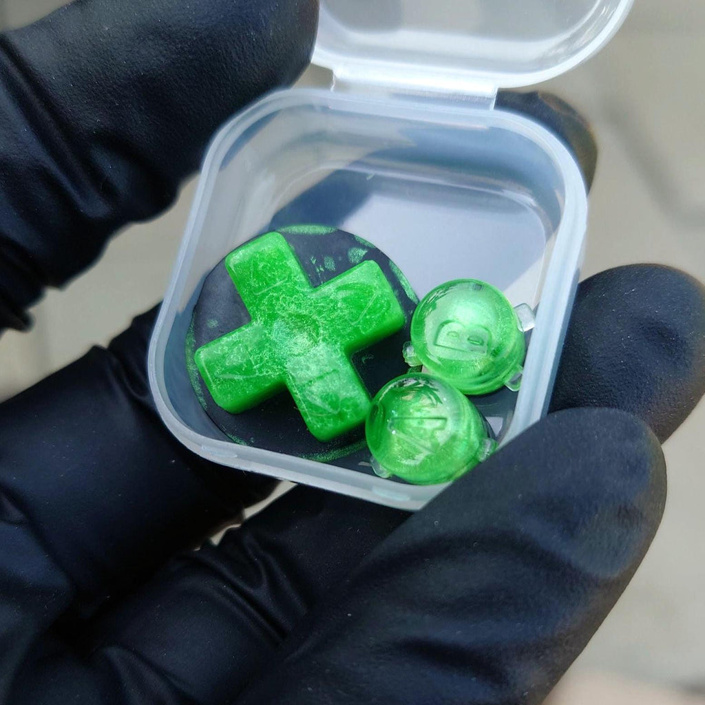 This listing is for a "Lime Green Nebula" Gameboy Advance (GBA) button set made using a fresh green pigment, and finished off with a dash of sparkles to resemble stars!